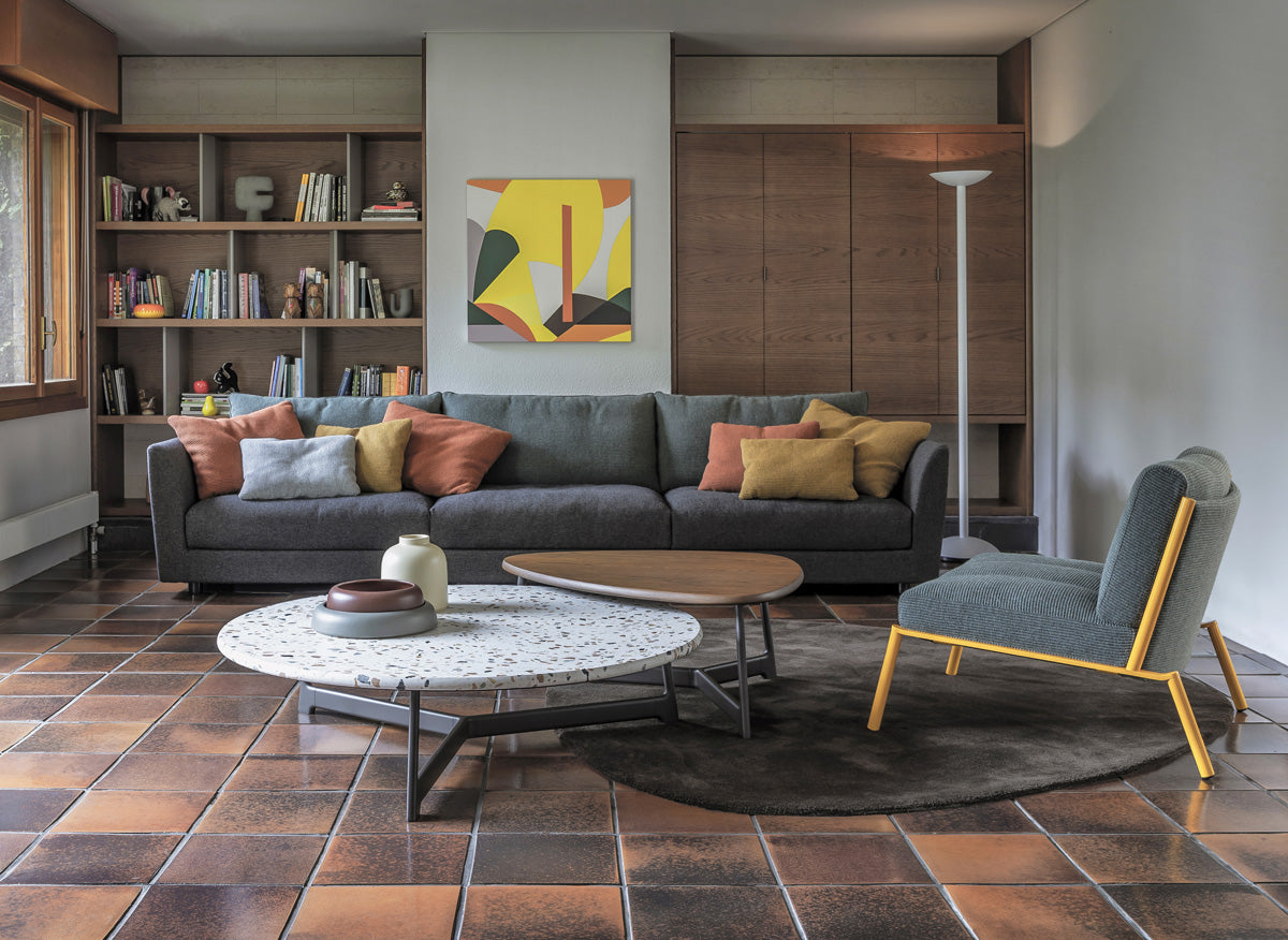 お気に入りのアートの色味をひろってコーディネートしたクッション、背面の棚に並んだたくさんの本や民芸品。カラフルだけれど統一感のあるリビングは、どこかほっとする懐かしさが漂います。色とりどりのクッションを置いたソファで寝そべったり、ラウンジチェアでひとりの時間を楽しんだりと、過ごし方も気分次第。角のないフォルムのラグやテーブルで、スタイリングに大らかな遊び心を加えて。