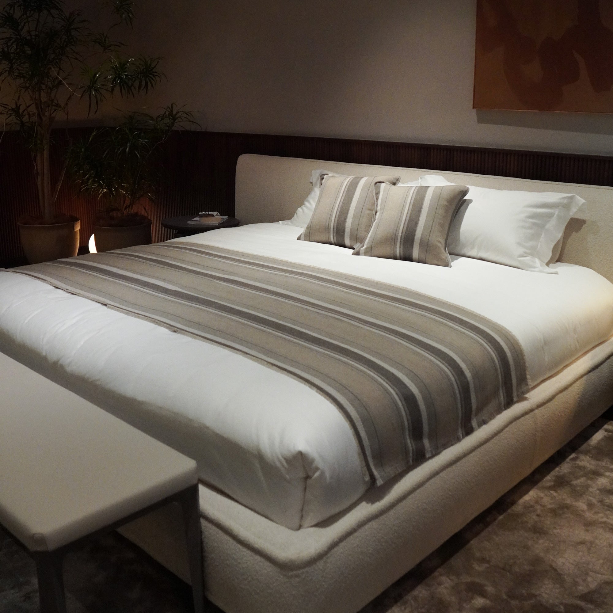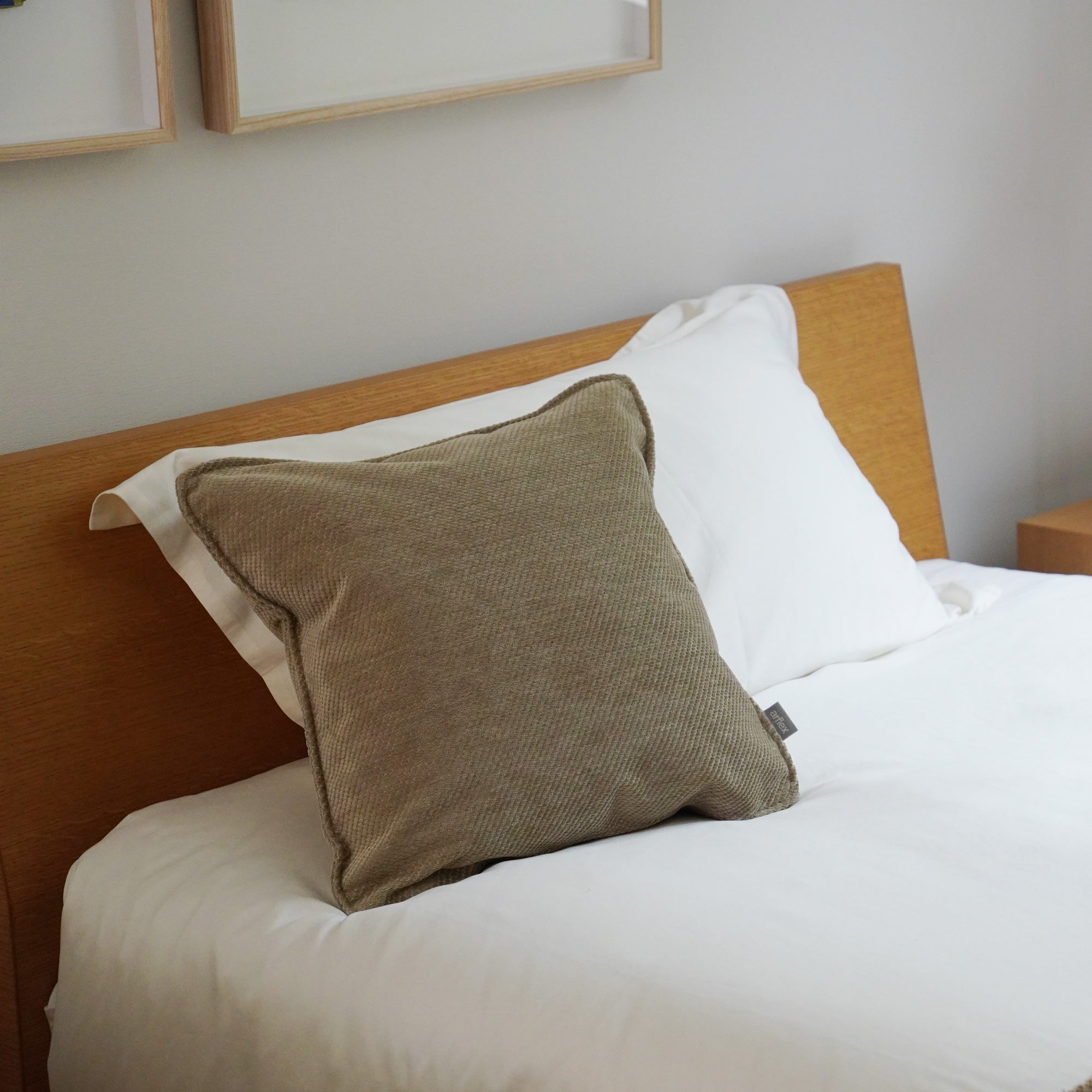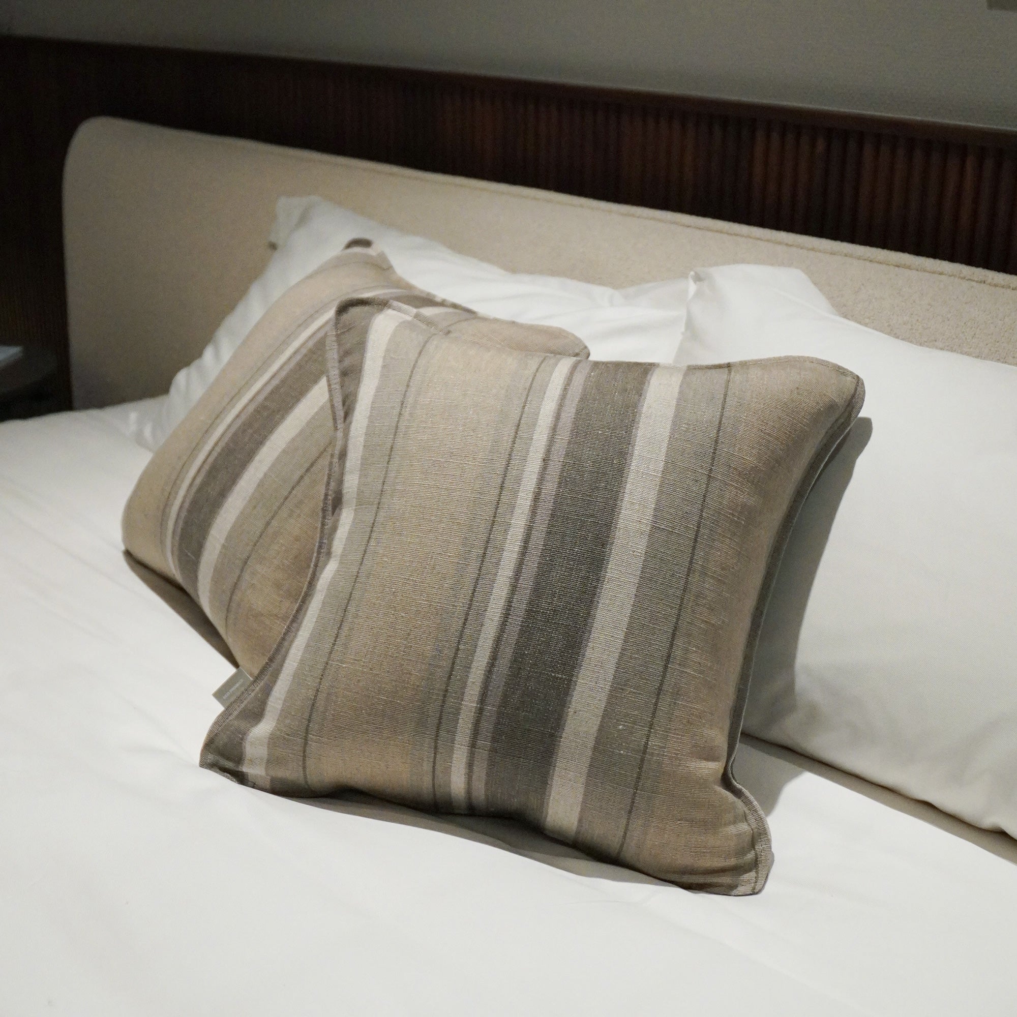 一緒にお届けする同柄のクッションをセットで使えば、 統一感のあるホテルライクなスタイリングに。ソファでくつろぐように、眠る前の豊かなひとときを演出します。