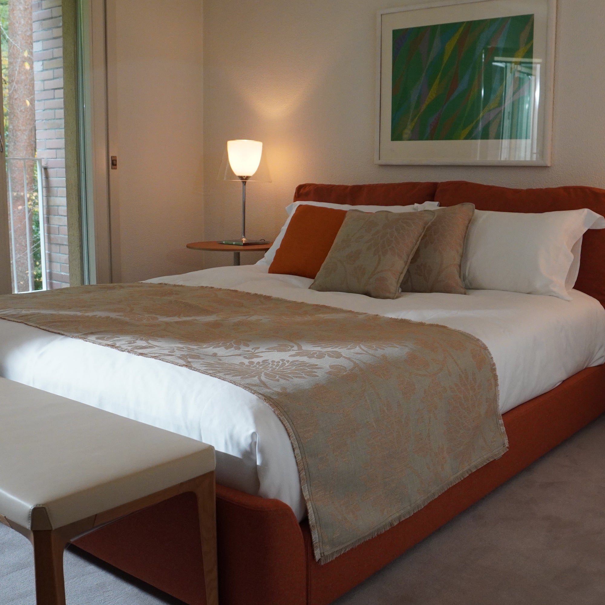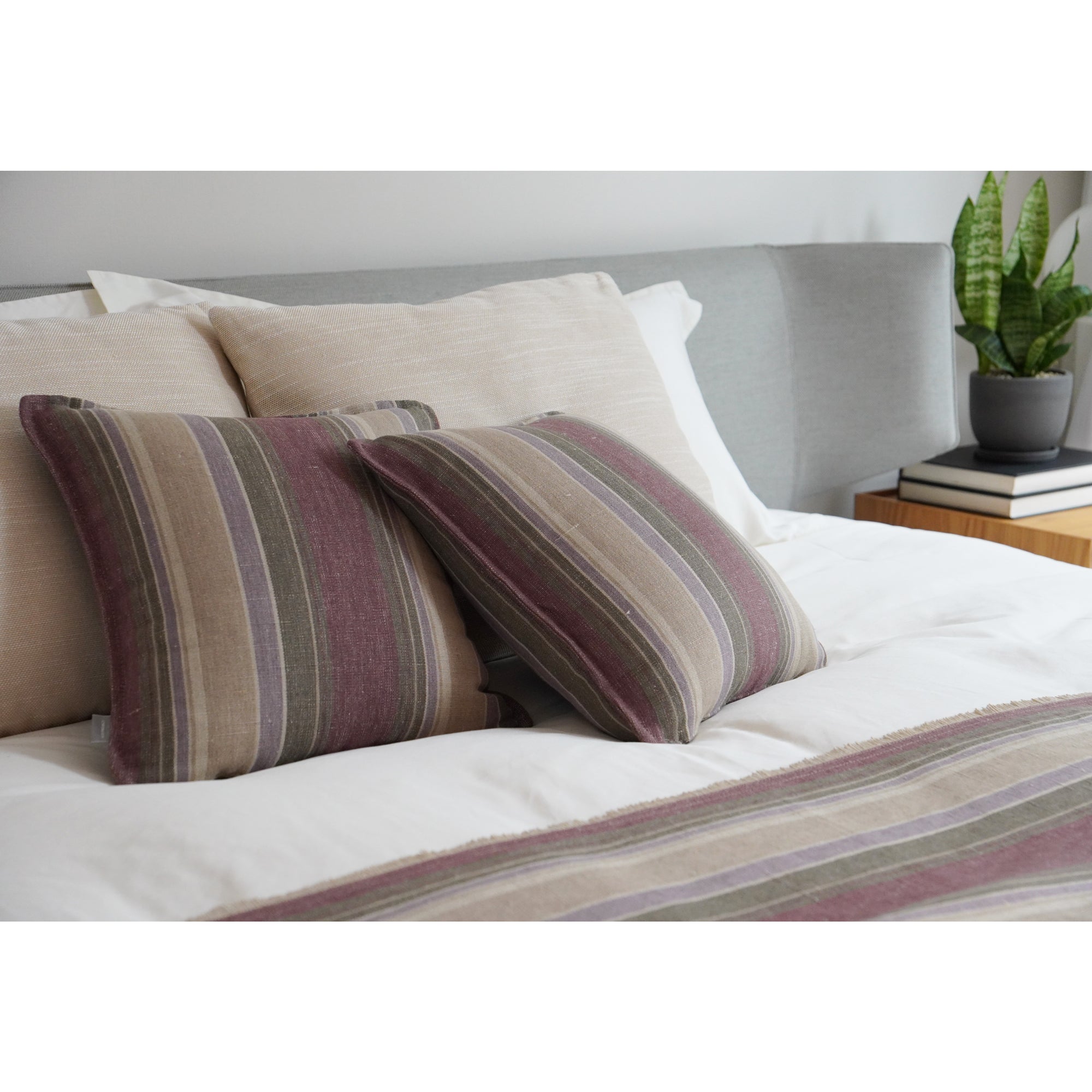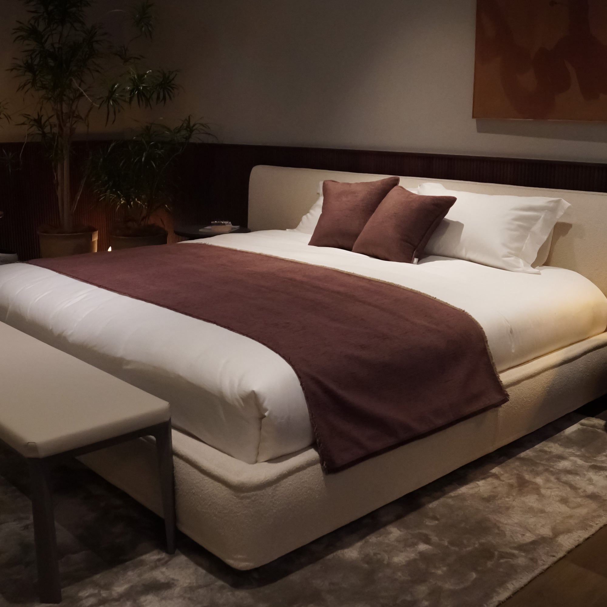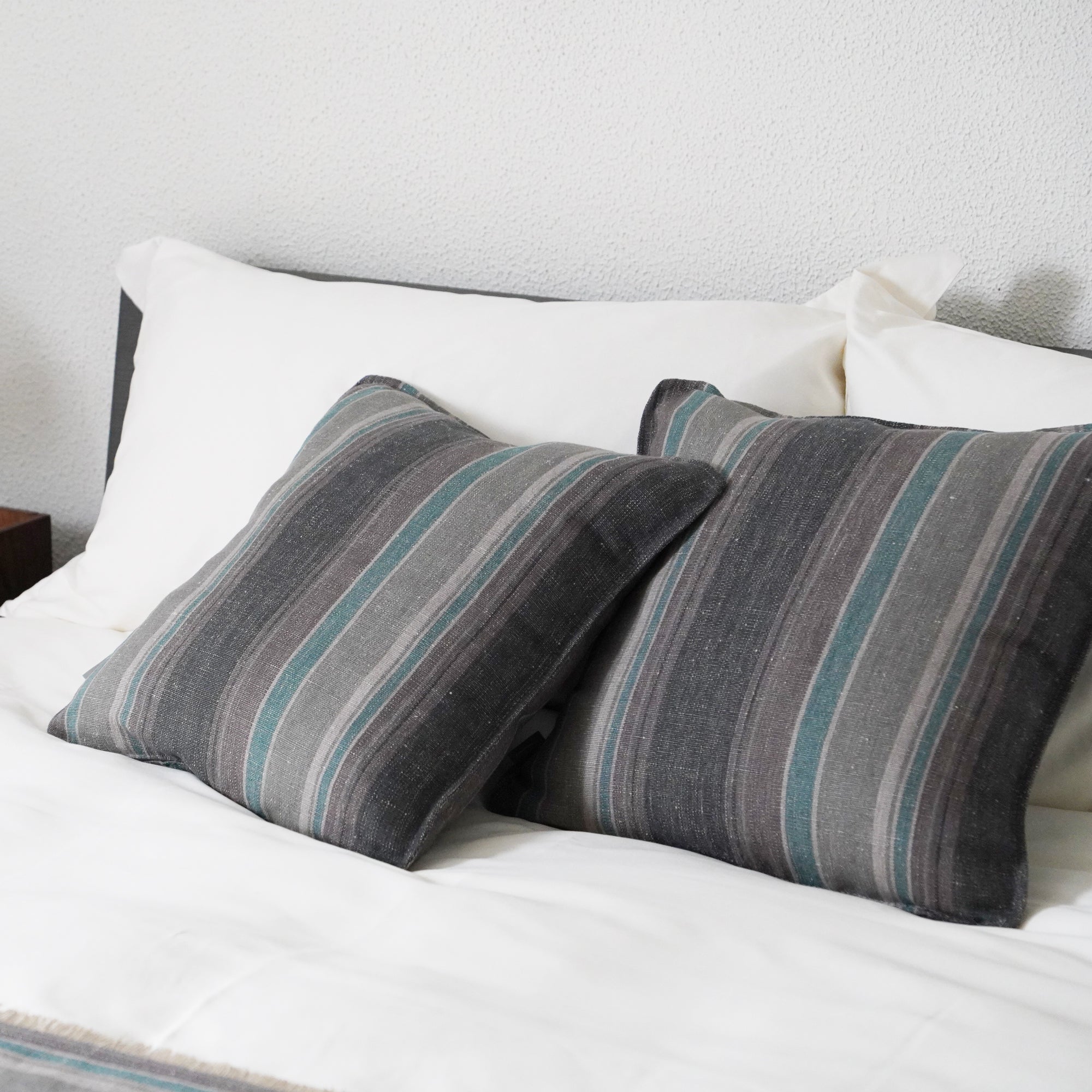 一緒にお届けする同柄のクッションをセットで使えば、 統一感のあるホテルライクなスタイリングに。ソファでくつろぐように、眠る前の豊かなひとときを演出します。