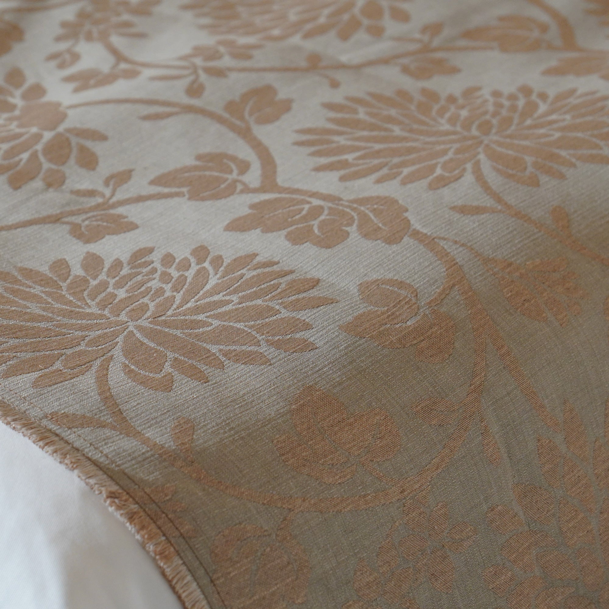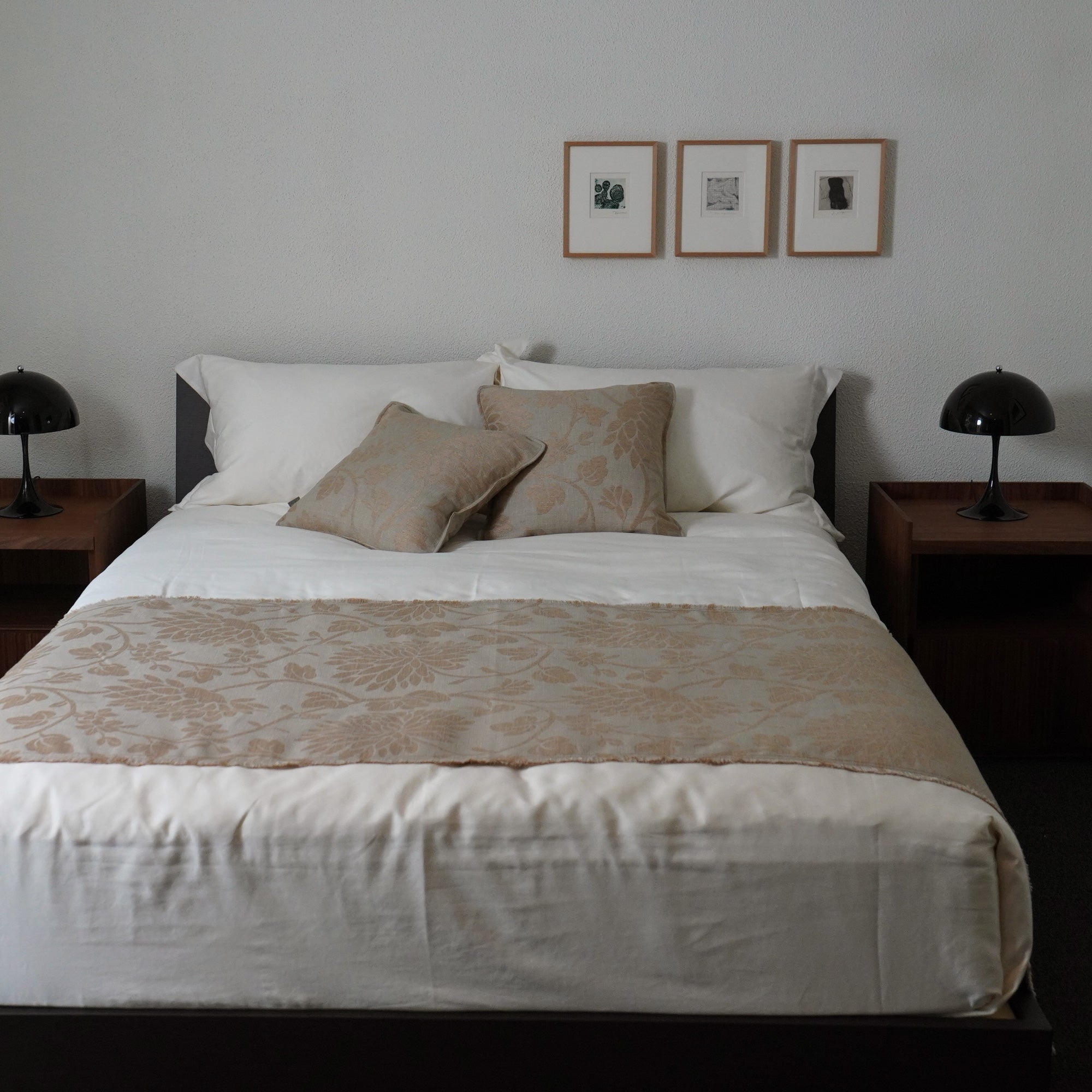さっと掛けるだけで寝室を華やかに彩ってくれるベッドスプレッドと、同柄のクッションカバーをセットでお届けします。