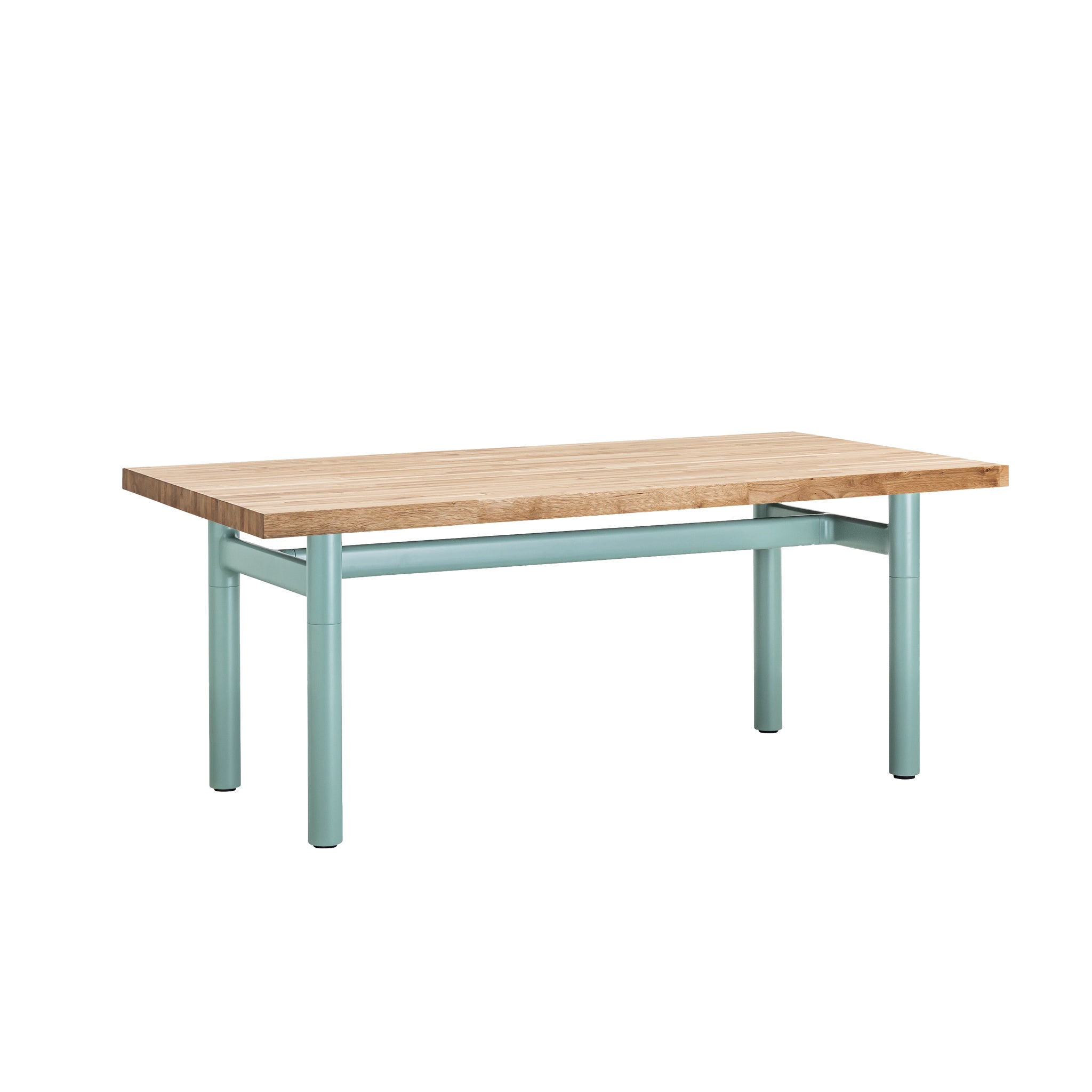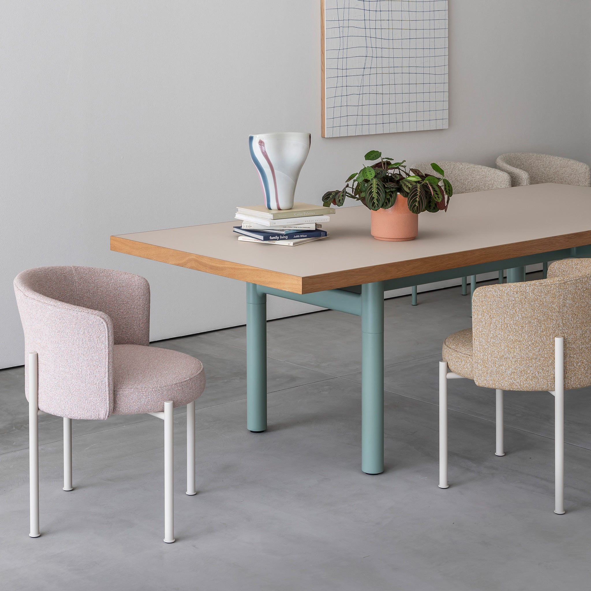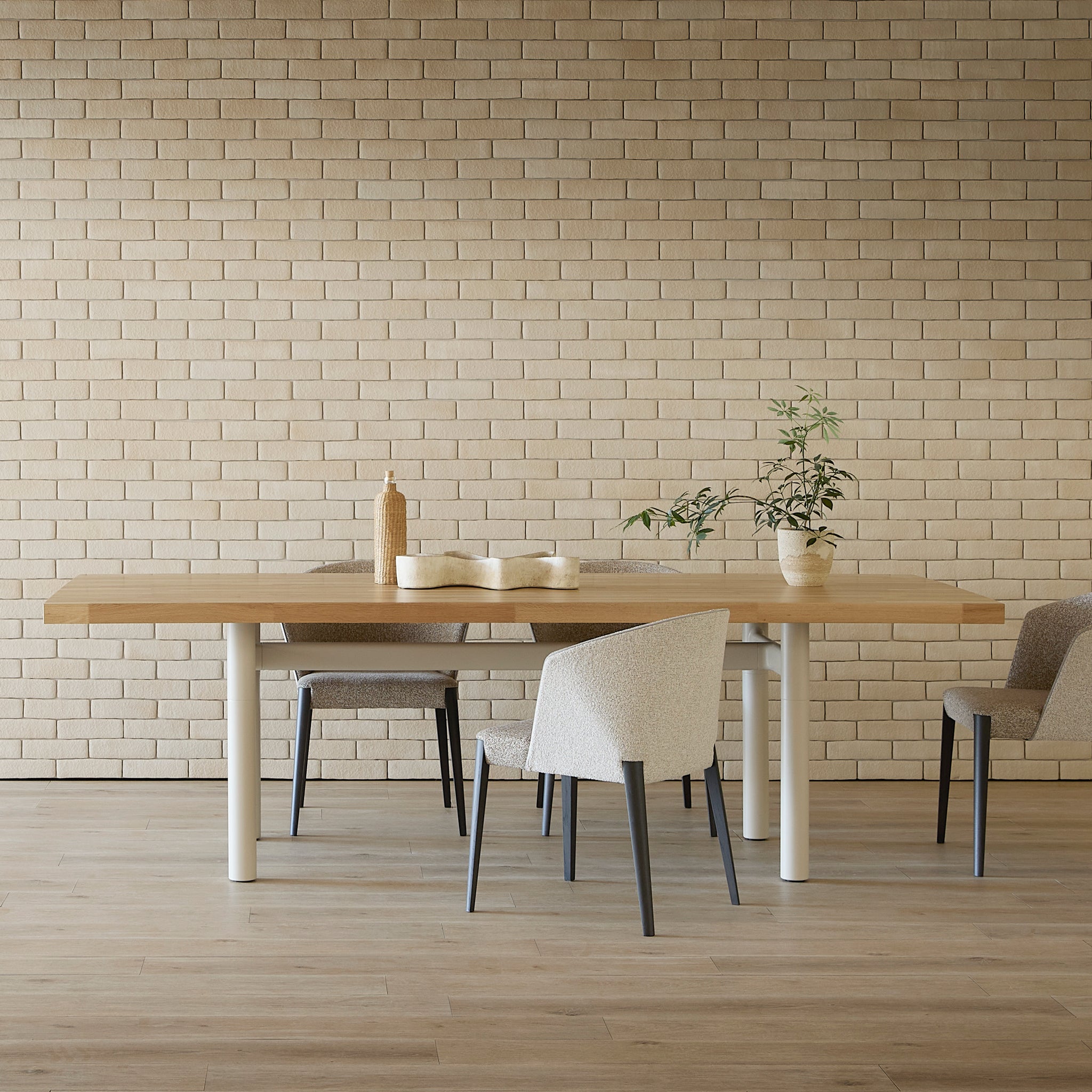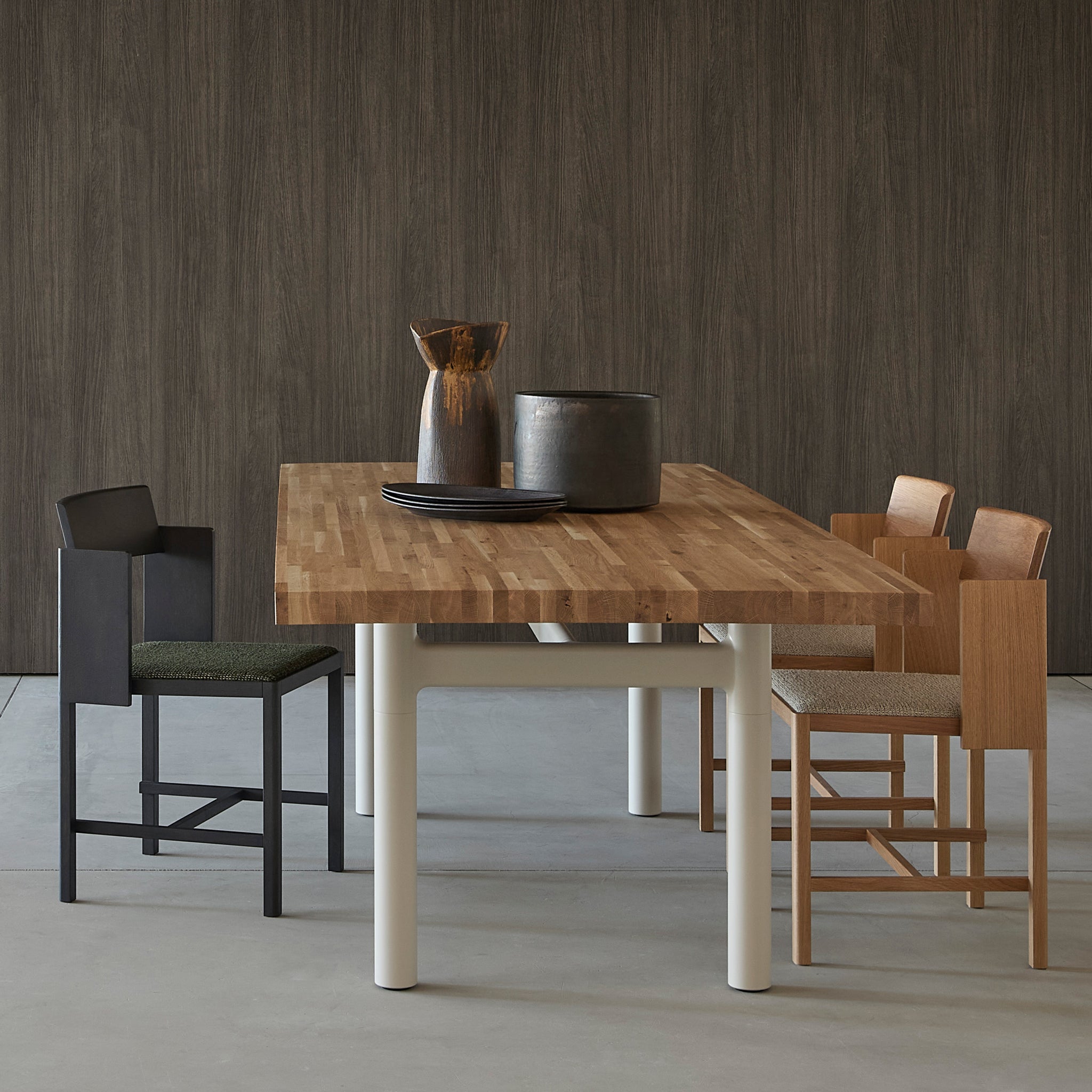 天板素材は2種類。木の端材をつなぎ合わせた集成材は、1点ごとに異なる豊かな表情が楽しいサステナブルな素材。FENIXは指紋がつきにくく、アルコール消毒もできる高機能素材。ダイニングはもちろんワークスペースにも適しています。
