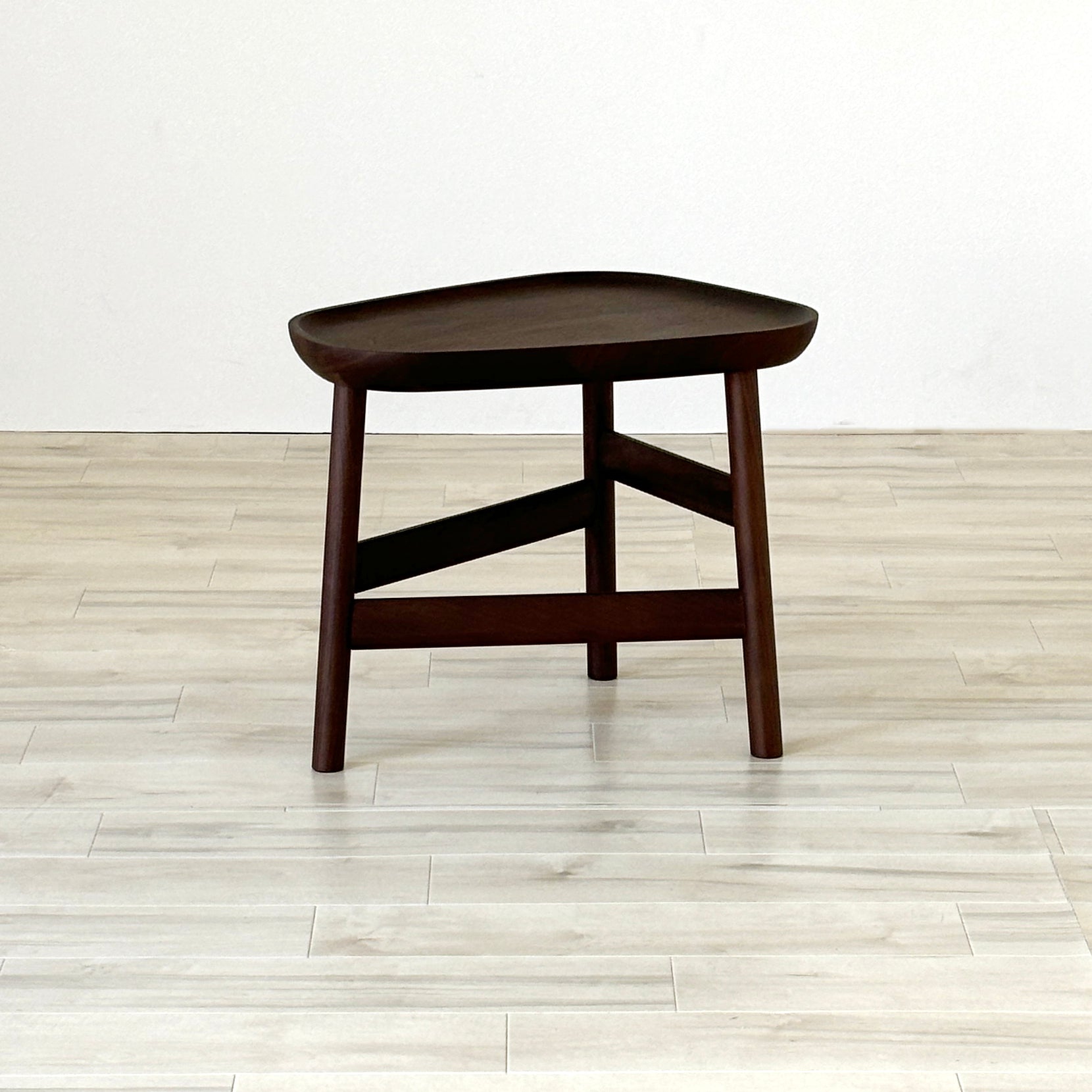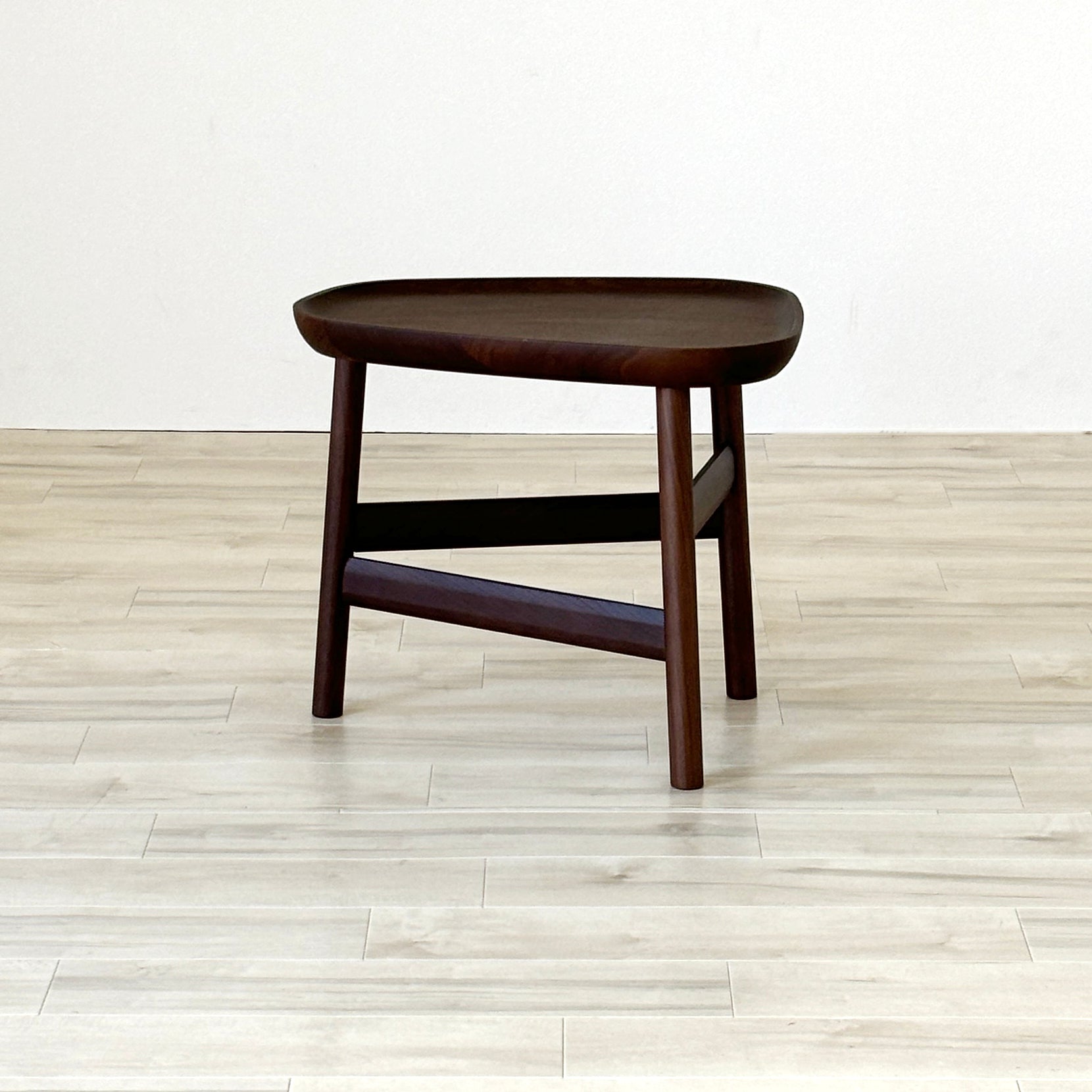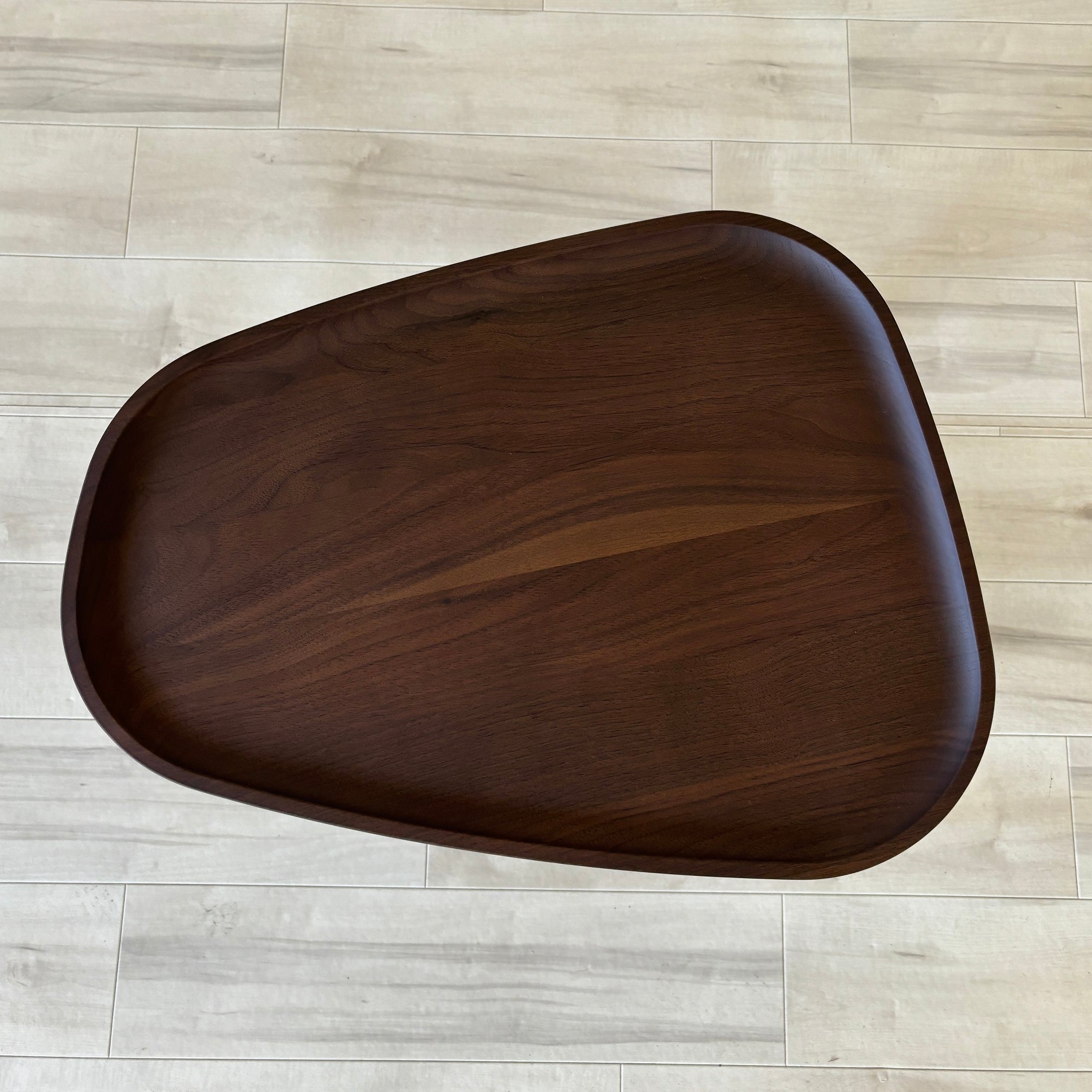 トレイ状に切り出した滑らかな無垢材天板のフォルムと、軽快な脚部が融合。方向性を持たないデザインは置く向きを選ばず、様々なシーンで活躍します。
